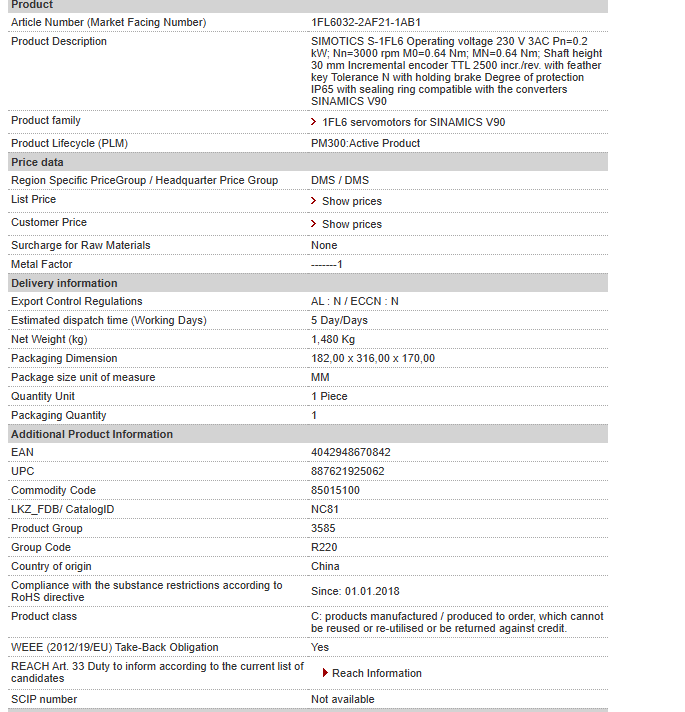 SIMOTICS S-1FL6 Operating voltage 230 V 3AC Pn=0.2 kW; Nn=3000 rpm M0=0.64 Nm; MN=0.64 Nm; Shaft height 30 mm Incremental encoder TTL 2500 incr./rev. with feather key Tolerance N with holding brake……