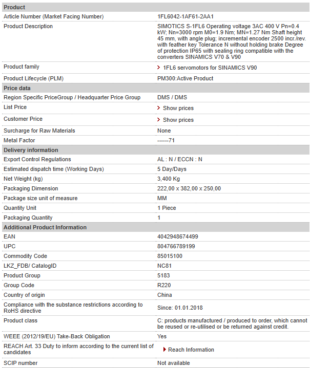 SIMOTICS S-1FL6 Operating voltage 3AC 400 V Pn=0.4 kW; Nn=3000 rpm M0=1.9 Nm; MN=1.27 Nm Shaft height 45 mm, with angle plug; incremental encoder 2500 incr./rev. with feather key Tolerance N withou……