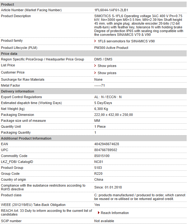 SIMOTICS S-1FL6 Operating voltage 3AC 400 V Pn=0.75 kW; Nn=3000 rpm M0=3.5 Nm; MN=2.39 Nm Shaft height 45 mm, with angle plug; absolute encoder 20-bits (12-bit multi-turn) with feather key, toleran……