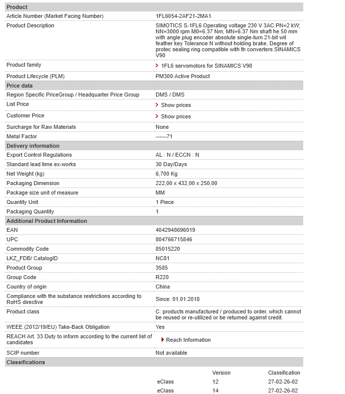 SIMOTICS S-1FL6 Operating voltage 230 V 3AC PN=2 kW; NN=3000 rpm M0=6.37 Nm; MN=6.37 Nm shaft he 50 mm with angle plug encoder absolute single-turn 21-bit wit feather key Tolerance N without holdin……