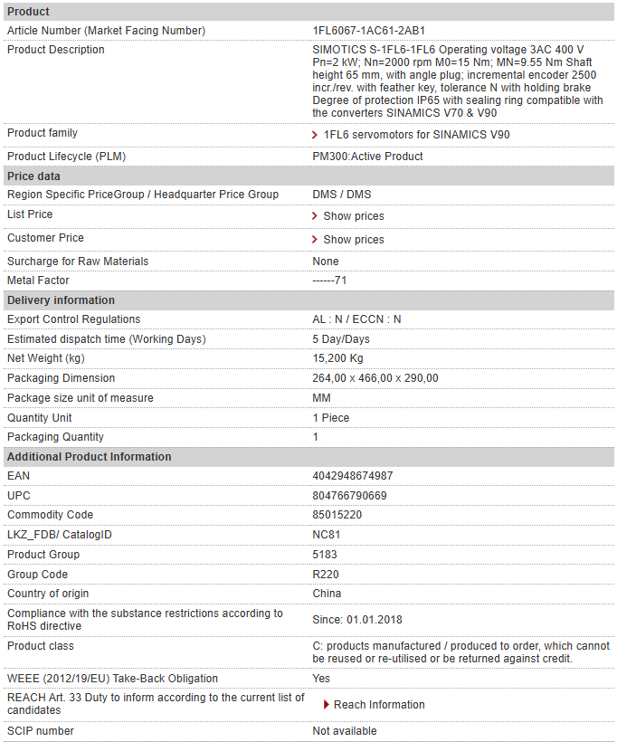 SIMOTICS S-1FL6-1FL6 Operating voltage 3AC 400 V Pn=2 kW; Nn=2000 rpm M0=15 Nm; MN=9.55 Nm Shaft height 65 mm, with angle plug; incremental encoder 2500 incr./rev. with feather key, tolerance N wit……