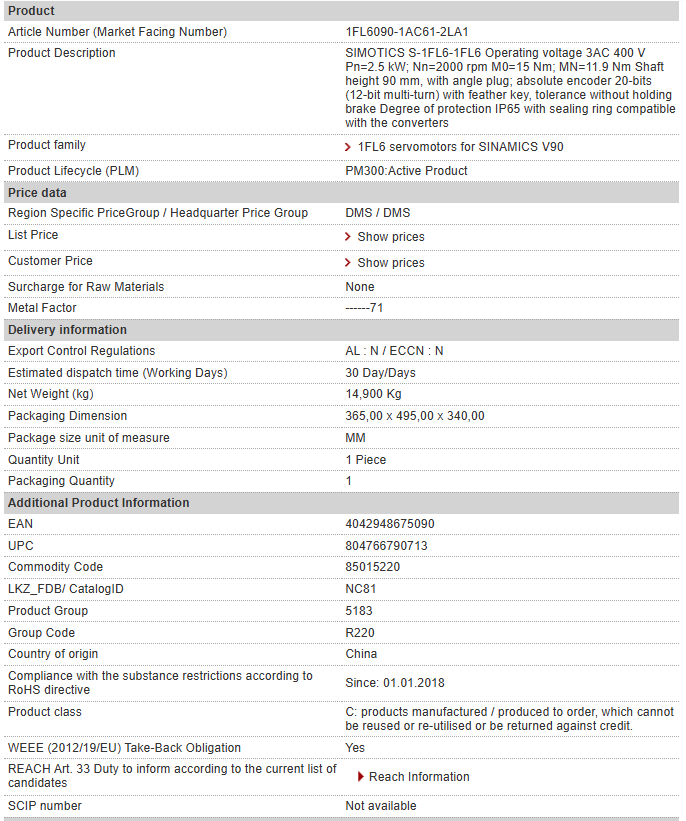 SIMOTICS S-1FL6-1FL6 Operating voltage 3AC 400 V Pn=2.5 kW; Nn=2000 rpm M0=15 Nm; MN=11.9 Nm Shaft height 90 mm, with angle plug; absolute encoder 20-bits (12-bit multi-turn) with feather key, tole……