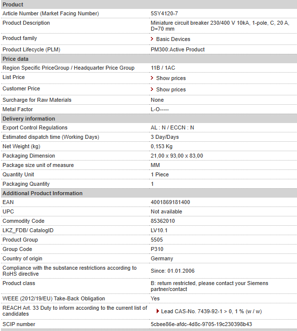 Miniature circuit breaker 230/400 V 10kA, 1-pole, C, 20 A, D=70 mm