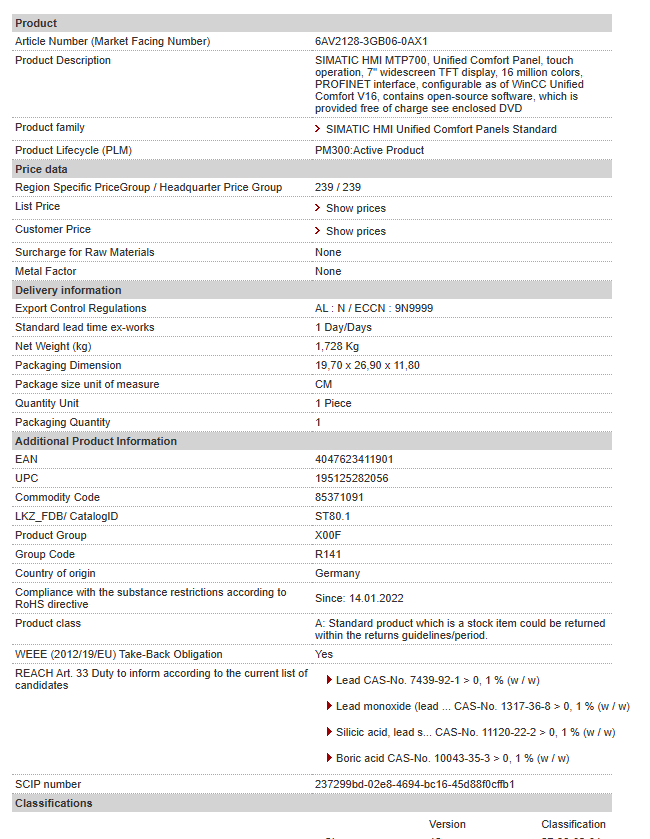 SIMATIC HMI MTP700, Unified Comfort Panel, touch operation, 7″ widescreen TFT display, 16 million colors, PROFINET interface, configurable as of WinCC Unified Comfort V16, contains open-sourc……