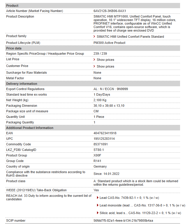 SIMATIC HMI MTP1000, Unified Comfort Panel, touch operation, 10.1″ widescreen TFT display, 16 million colors, PROFINET interface, configurable as of WinCC Unified Comfort V16, contains open-s……