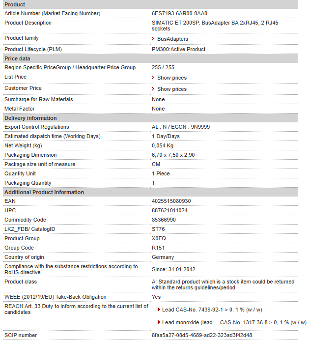SIMATIC ET 200SP, BusAdapter BA 2xRJ45, 2 RJ45 sockets