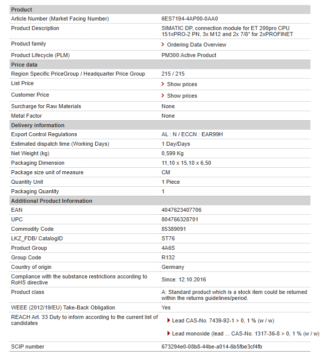 SIMATIC DP, connection module for ET 200pro CPU 151xPRO-2 PN, 3x M12 and 2x 7/8″ for 2xPROFINET