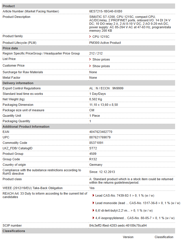 SIMATIC S7-1200, CPU 1215C, compact CPU, AC/DC/relay, 2 PROFINET ports, onboard I/O: 14 DI 24 V DC; 10 DO relay 2 A, 2 AI 0-10 V DC, 2 AO 0-20 mA DC, power supply: AC 85-264 V AC at 47-63 Hz, progr……