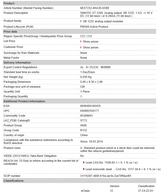 SIMATIC S7-1200, Analog output, SB 1232, 1 AO, +/-10 V DC (12 bit resol.) or 0-20mA (11 bit resol.)