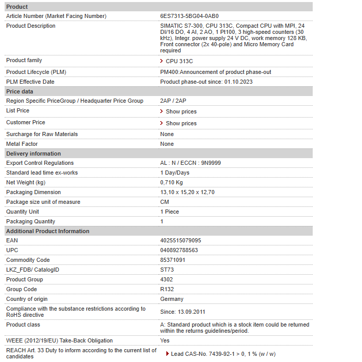 SIMATIC S7-300, CPU 313C, Compact CPU with MPI, 24 DI/16 DO, 4 AI, 2 AO, 1 Pt100, 3 high-speed counters (30 kHz), Integr. power supply 24 V DC, work memory 128 KB, Front connector (2x 40-pole) and ……