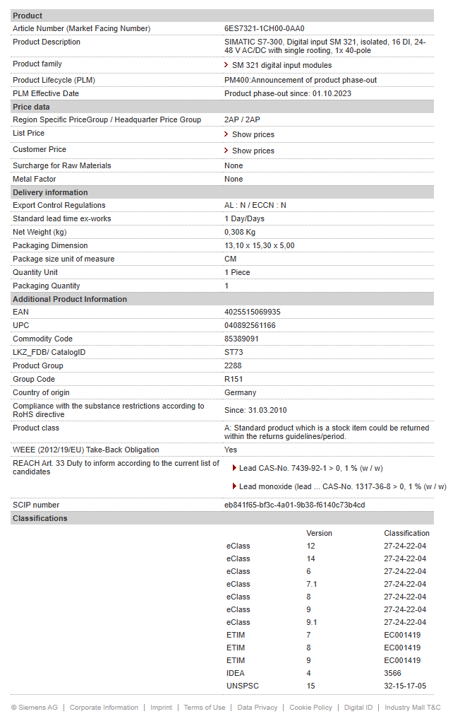 SIMATIC S7-300, Digital input SM 321, isolated, 16 DI, 24-48 V AC/DC with single rooting, 1x 40-pole