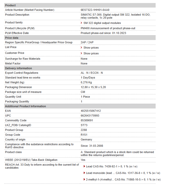 SIMATIC S7-300, Digital output SM 322, Isolated 16 DO, relay contacts, 1x 20-pole