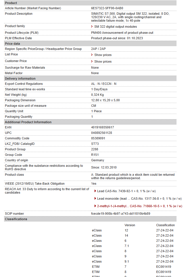 SIMATIC S7-300, Digital output SM 322, isolated, 8 DO, 120/230 V AC, 2A, with single rooting/channel and selectable failure mode, 1x 40-pole