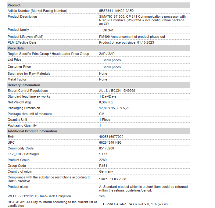 SIMATIC S7-300, CP 341 Communications processor with RS232C interface (RS-232-C) incl. configuration package on CD
