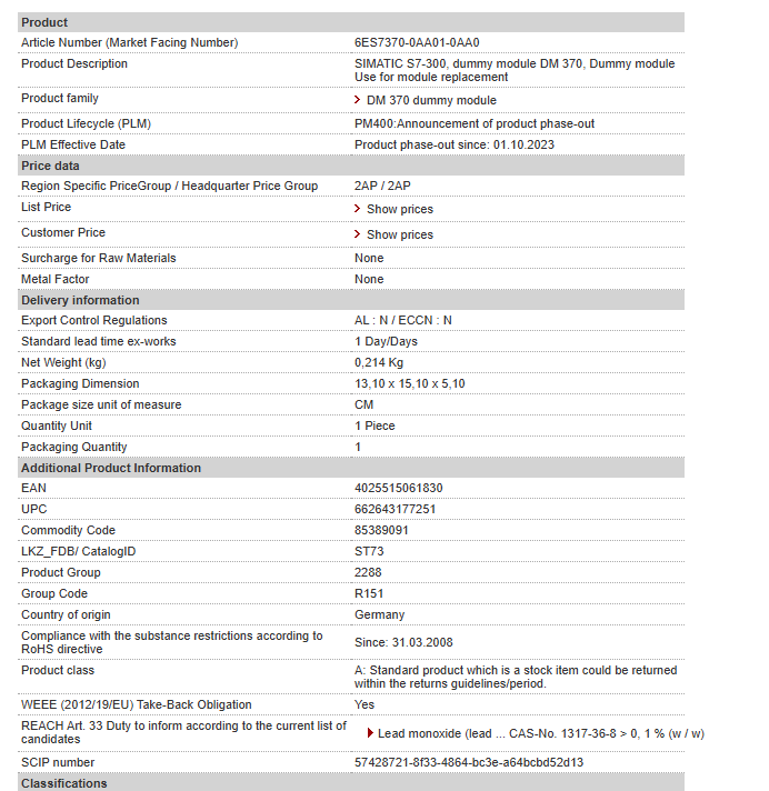 SIMATIC S7-300, dummy module DM 370, Dummy module Use for module replacement