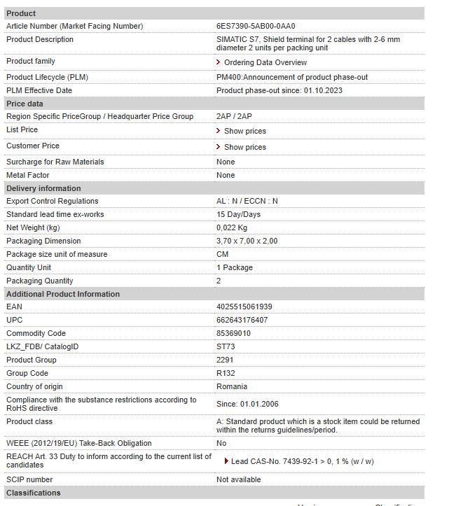 SIMATIC S7, Shield terminal for 2 cables with 2-6 mm diameter 2 units per packing unit