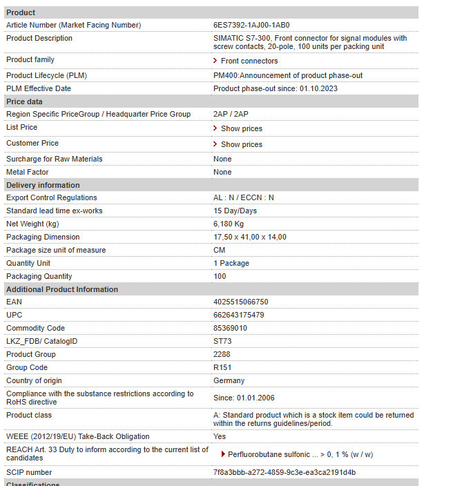 SIMATIC S7-300, Front connector for signal modules with screw contacts, 20-pole, 100 units per packing unit