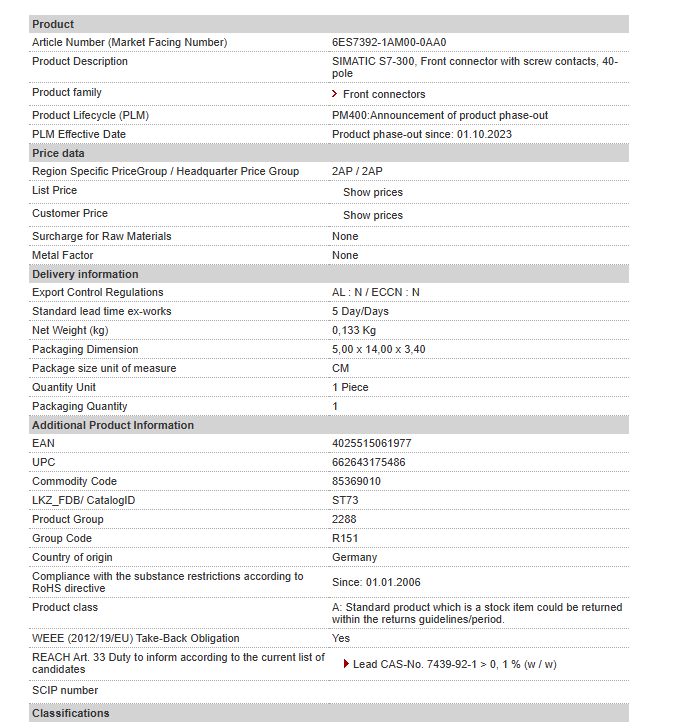 SIMATIC S7-300, Front connector with screw contacts, 40-pole