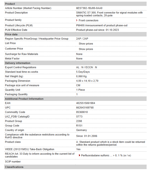 SIMATIC S7-300, Front connector for signal modules with spring-loaded contacts, 20-pole