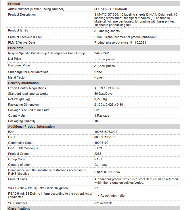 SIMATIC S7-300, 10 labeling sheets DIN A4, Color: red, 10 labeling strips/sheet, for signal modules (32 channels), Material: foil, pre-perforated, for printing with laser printer, 10 sheets per pac……