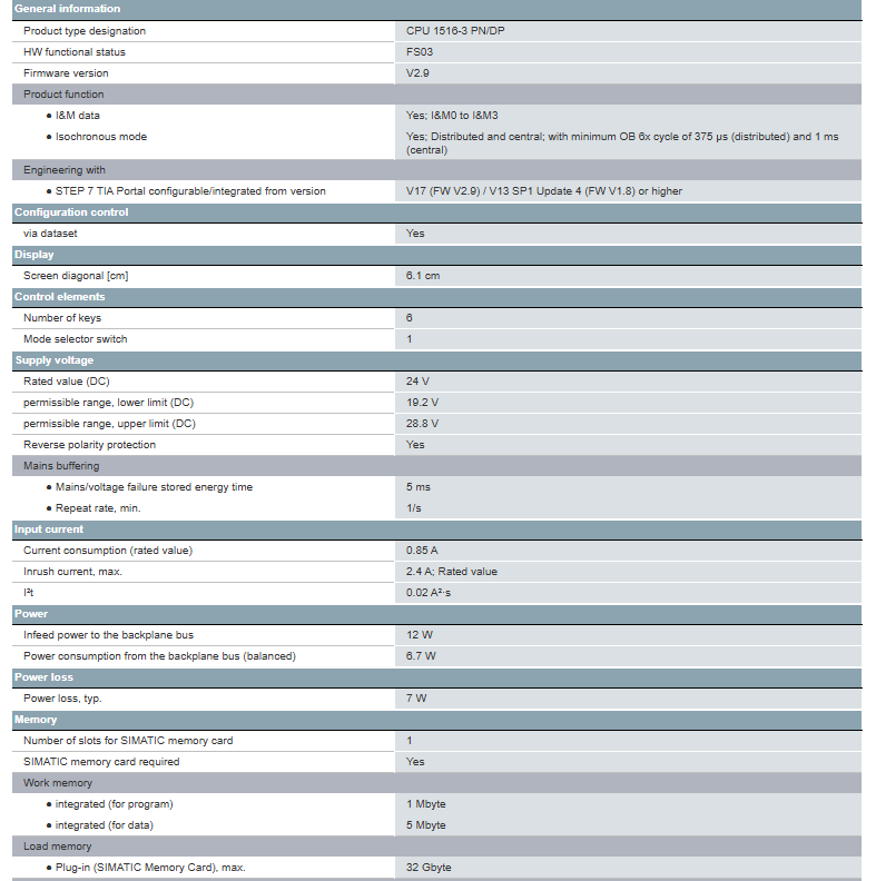 *** Spare part *** SIMATIC S7-1500, CPU 1516-3 PN/DP, central processing unit with work memory 1 MB for program and 5 MB for data, 1st interface: PROFINET IRT with 2-port switch, 2nd interface: PRO……