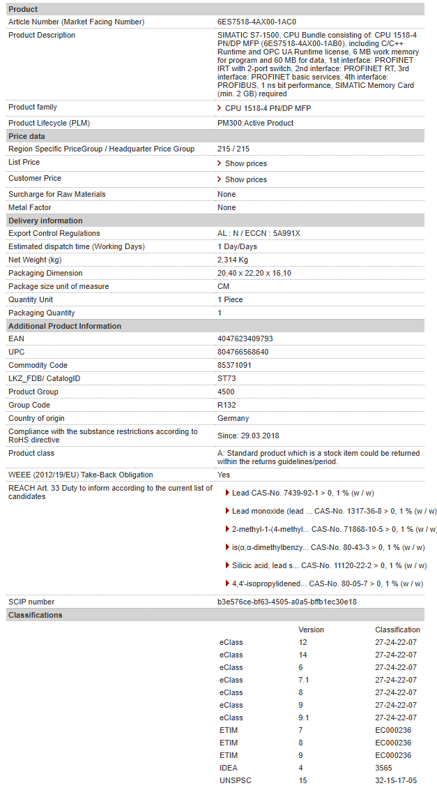 SIMATIC S7-1500, CPU Bundle consisting of: CPU 1518-4 PN/DP MFP (6ES7518-4AX00-1AB0), including C/C++ Runtime and OPC UA Runtime license, 6 MB work memory for program and 60 MB for data, 1st interf……