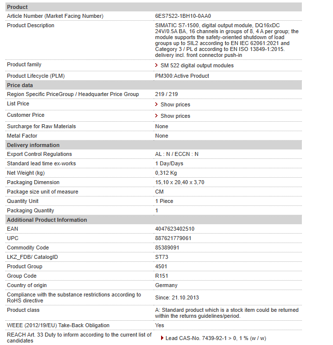 SIMATIC S7-1500, digital output module, DQ16xDC 24V/0.5A BA, 16 channels in groups of 8, 4 A per group; the module supports the safety-oriented shutdown of load groups up to SIL2 according to EN IE……