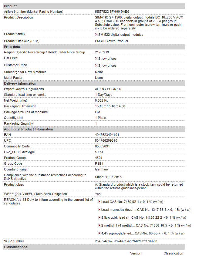 SIMATIC S7-1500, digital output module DQ 16×230 V AC/1 A ST; TRIAC; 16 channels in groups of 2; 2 A per group; Substitute value: Front connector (screw terminals or push-in) to be ordered sep……