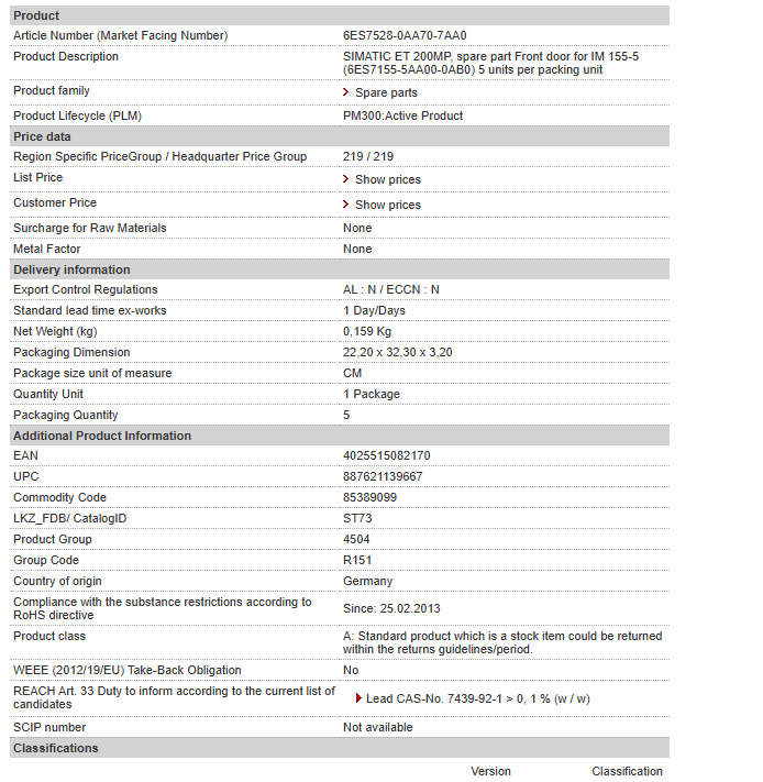 SIMATIC ET 200MP, spare part Front door for IM 155-5 (6ES7155-5AA00-0AB0) 5 units per packing unit