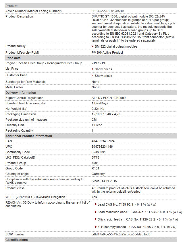 SIMATIC S7-1500, digital output module DQ 32x24V DC/0.5A HF; 32 channels in groups of 8; 4 A per group; single-channel diagnostics; substitute value, switching cycle counter for connected actuators……