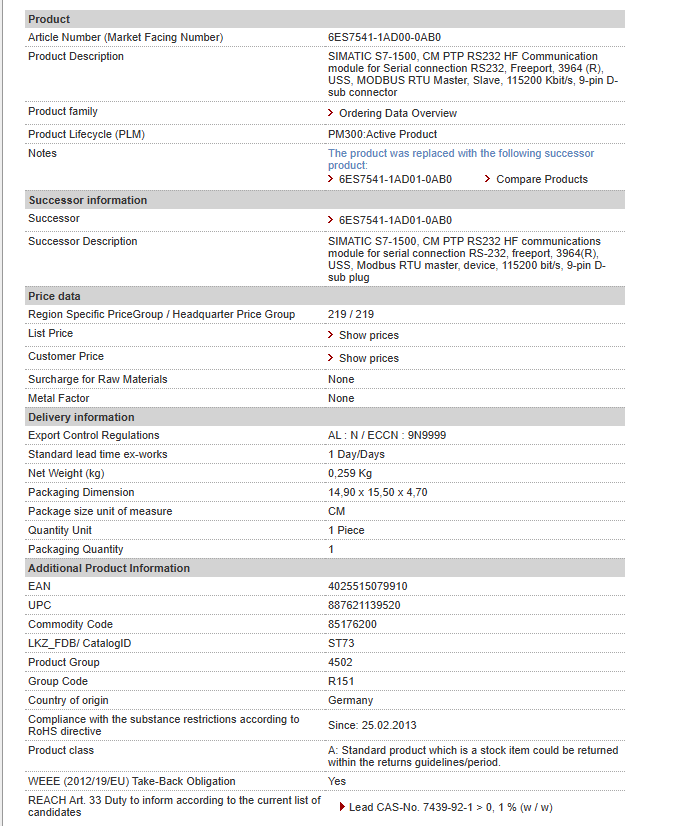 SIMATIC S7-1500, CM PTP RS232 HF Communication module for Serial connection RS232, Freeport, 3964 (R), USS, MODBUS RTU Master, Slave, 115200 Kbit/s, 9-pin D-sub connector