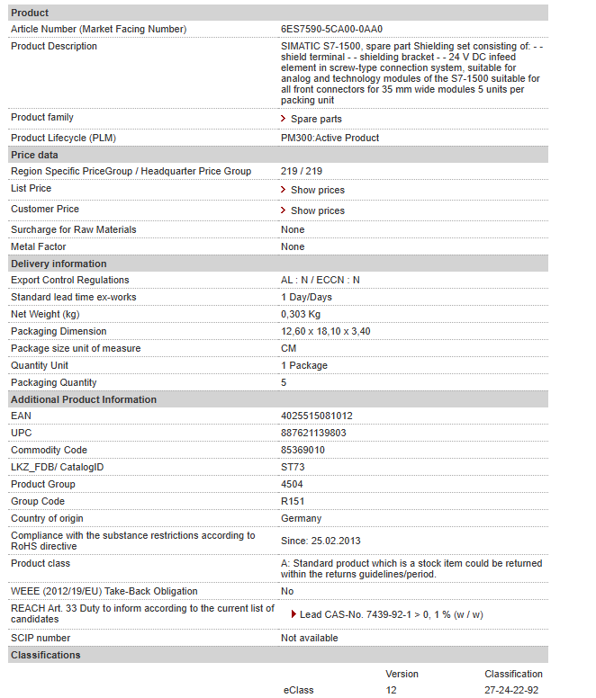 SIMATIC S7-1500, spare part Shielding set consisting of: – – shield terminal – – shielding bracket – – 24 V DC infeed element in screw-type connection system, su……