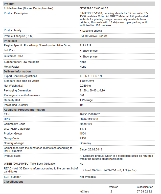 SIMATIC S7-1500, Labeling sheets for 35 mm wide S7-1500 modules Color: AL GREY Material: foil, perforated; suitable for printing using commercially available laser printers; 10 sheets with 10 strip……