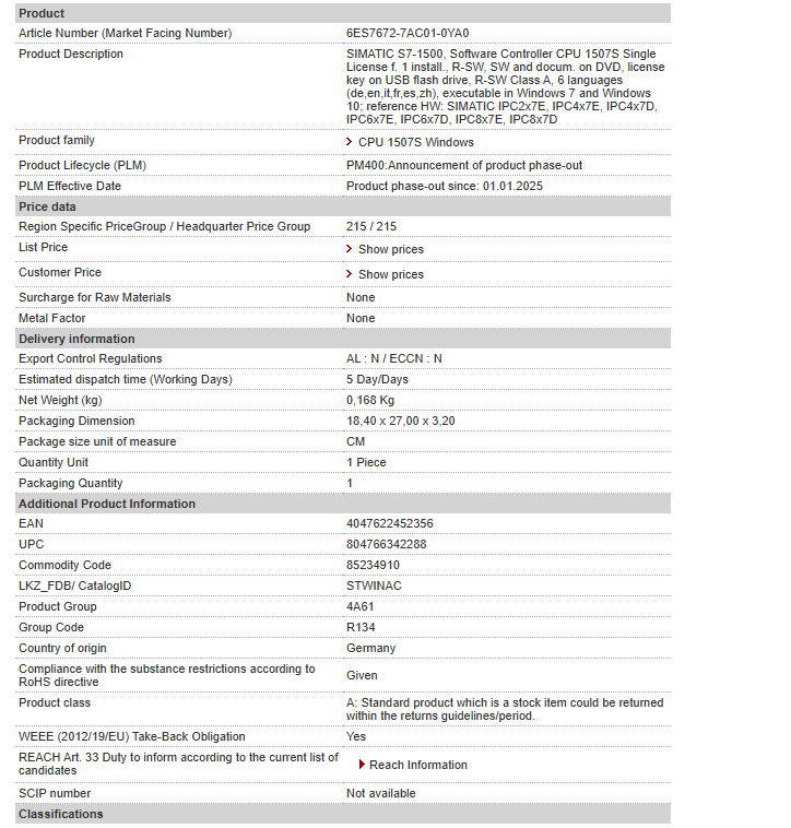 SIMATIC S7-1500, Software Controller CPU 1507S Single License f. 1 install., R-SW, SW and docum. on DVD, license key on USB flash drive, R-SW Class A, 6 languages (de,en,it,fr,es,zh), executable in……