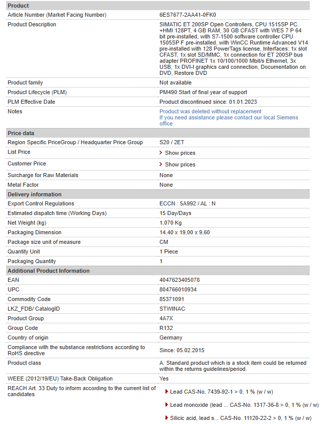 SIMATIC ET 200SP Open Controllers, CPU 1515SP PC. +HMI 128PT, 4 GB RAM, 30 GB CFAST with WES 7 P 64 bit pre-installed, with S7-1500 software controller CPU 1505SP F pre-installed, with WinCC Runtim……