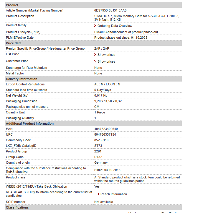 SIMATIC S7, Micro Memory Card for S7-300/C7/ET 200, 3, 3V Nflash, 512 KB