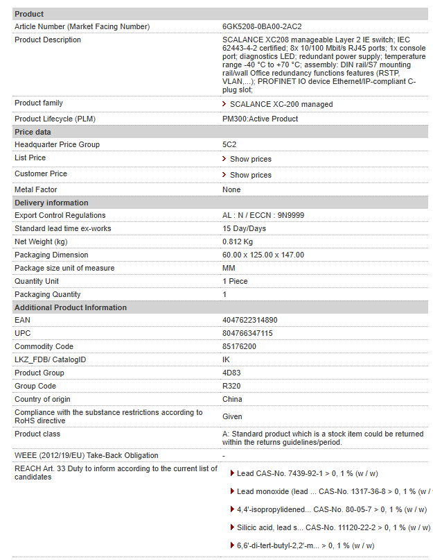 SCALANCE XC208 manageable Layer 2 IE switch; IEC 62443-4-2 certified; 8x 10/100 Mbit/s RJ45 ports; 1x console port; diagnostics LED; redundant power supply; temperature range -40 °C to +70 °C; asse……