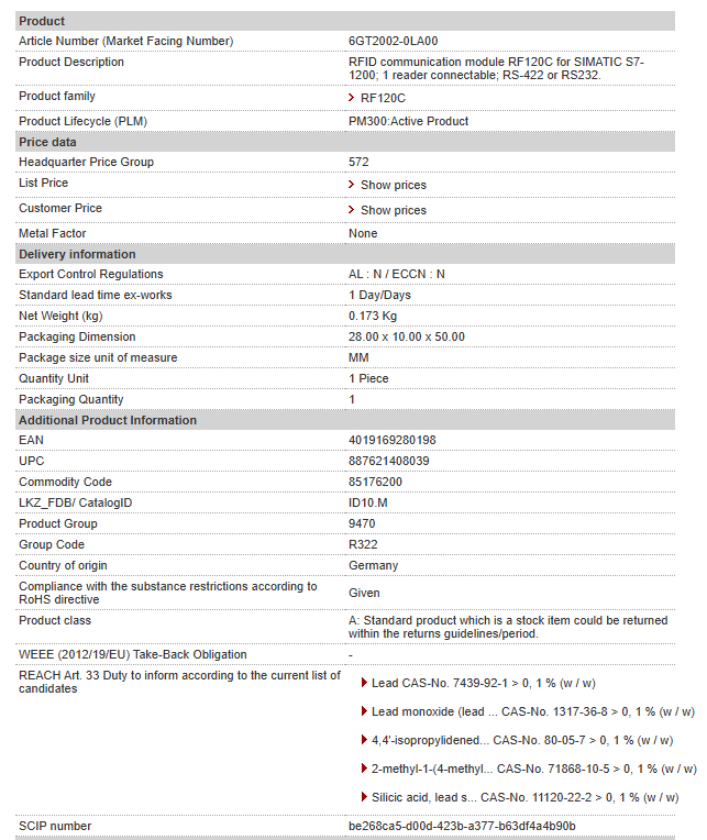 RFID communication module RF120C for SIMATIC S7-1200; 1 reader connectable; RS-422 or RS232.