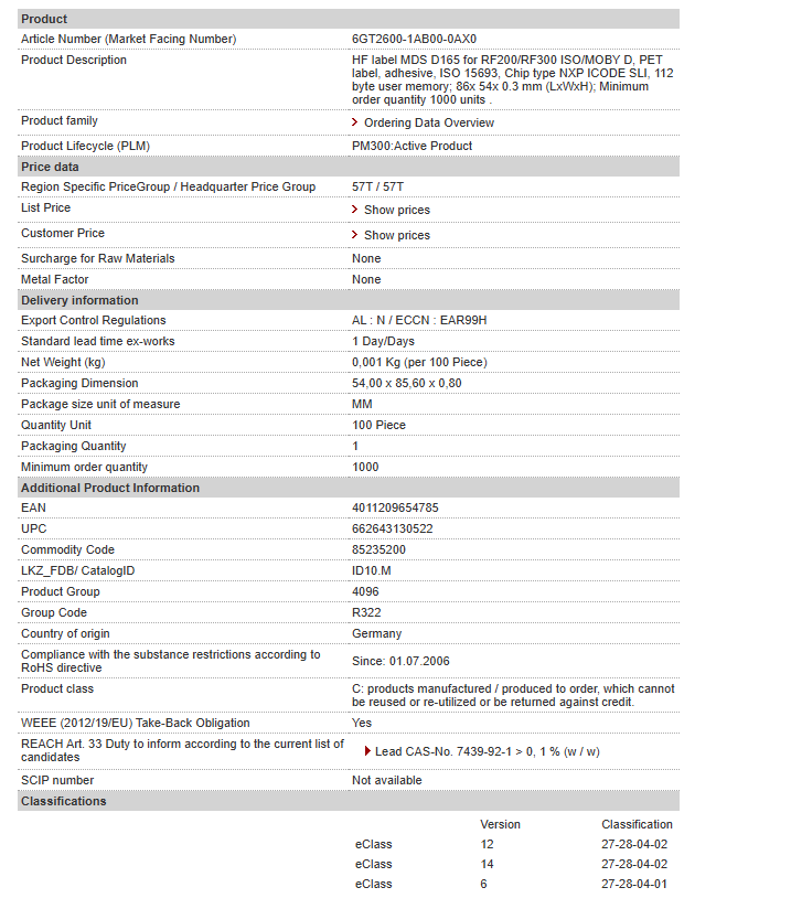 HF label MDS D165 for RF200/RF300 ISO/MOBY D, PET label, adhesive, ISO 15693, Chip type NXP ICODE SLI, 112 byte user memory; 86x 54x 0.3 mm (LxWxH); Minimum order quantity 1000 units .