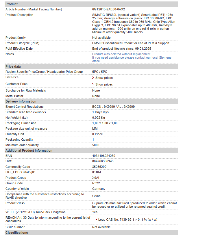 SIMATIC RF630L (special variant) SmartLabel PET; 105x 25 mm; strongly adhesive on plastic ISO 18000-6C, EPC Class 1 GEN 2 frequency 860 to 960 MHz, Chip Type Alien Higgs 3, EPC 96 bit expandable up……
