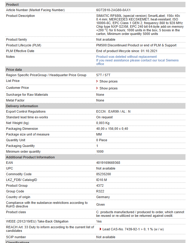 SIMATIC RF680L (special version) SmartLabel; 156x 40x 0.4 mm; MERCEDES KECSKEMET, heat-resistant; ISO 18000-6C, EPC Class 1 GEN 2, frequency 860 to 928 MHz Chip type NXP G2XM, EPC 240 bit 64-byte a……