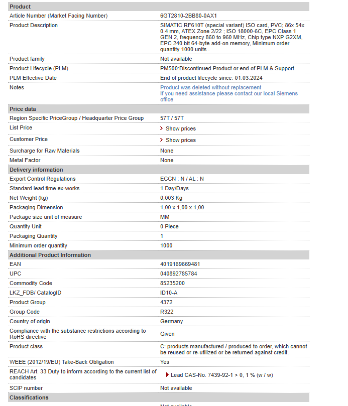 SIMATIC RF610T (special variant) ISO card, PVC; 86x 54x 0.4 mm, ATEX Zone 2/22 ; ISO 18000-6C, EPC Class 1 GEN 2, frequency 860 to 960 MHz, Chip type NXP G2XM, EPC 240 bit 64-byte add-on memory, Mi……