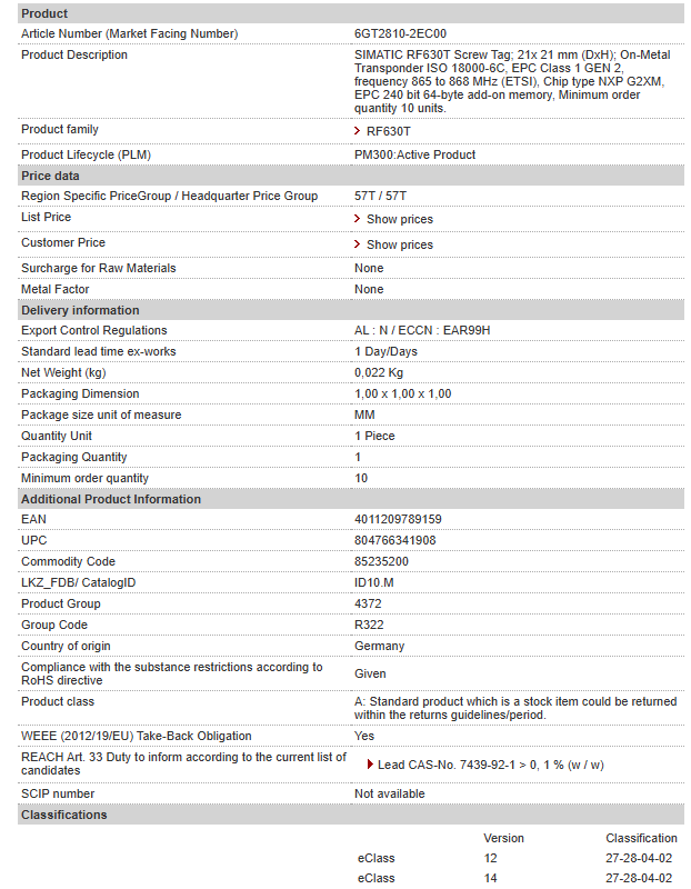 SIMATIC RF630T Screw Tag; 21x 21 mm (DxH); On-Metal Transponder ISO 18000-6C, EPC Class 1 GEN 2, frequency 865 to 868 MHz (ETSI), Chip type NXP G2XM, EPC 240 bit 64-byte add-on memory, Minimum orde……