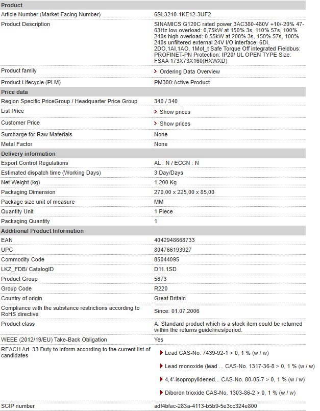 SINAMICS G120C rated power 3AC380-480V +10/-20% 47-63Hz low overload: 0,75kW at 150% 3s, 110% 57s, 100% 240s high overload: 0,55kW at 200% 3s, 150% 57s, 100% 240s unfiltered external 24V I/O interf……