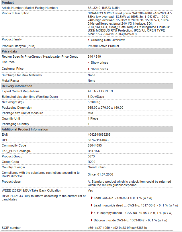 SINAMICS G120C rated power 3AC380-480V +10/-20% 47-63Hz low overload: 18,5kW at 150% 3s, 110% 57s, 100% 240s high overload: 15,0kW at 200% 3s, 150% 57s, 100% 240s unfiltered external 24V I/O interf……