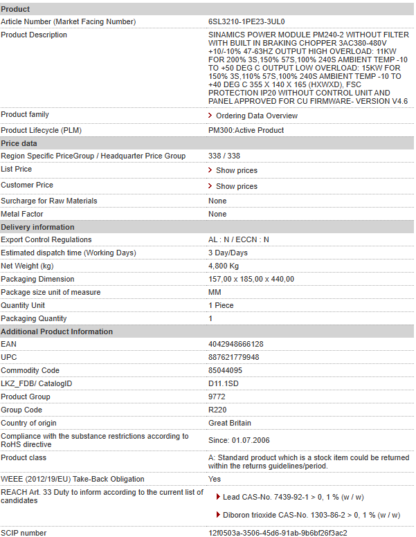 SINAMICS POWER MODULE PM240-2 WITHOUT FILTER WITH BUILT IN BRAKING CHOPPER 3AC380-480V +10/-10% 47-63HZ OUTPUT HIGH OVERLOAD: 11KW FOR 200% 3S,150% 57S,100% 240S AMBIENT TEMP -10 TO +50 DEG C OUTPU……