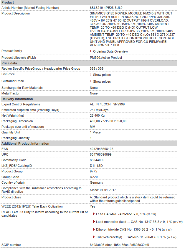 SINAMICS G120 POWER MODULE PM240-2 WITHOUT FILTER WITH BUILT IN BRAKING CHOPPER 3AC380-480V +10/-20% 47-63HZ OUTPUT HIGH OVERLOAD: 37KW FOR 200% 3S,150% 57S,100% 240S AMBIENT TEMP -20 TO +50 DEG C ……