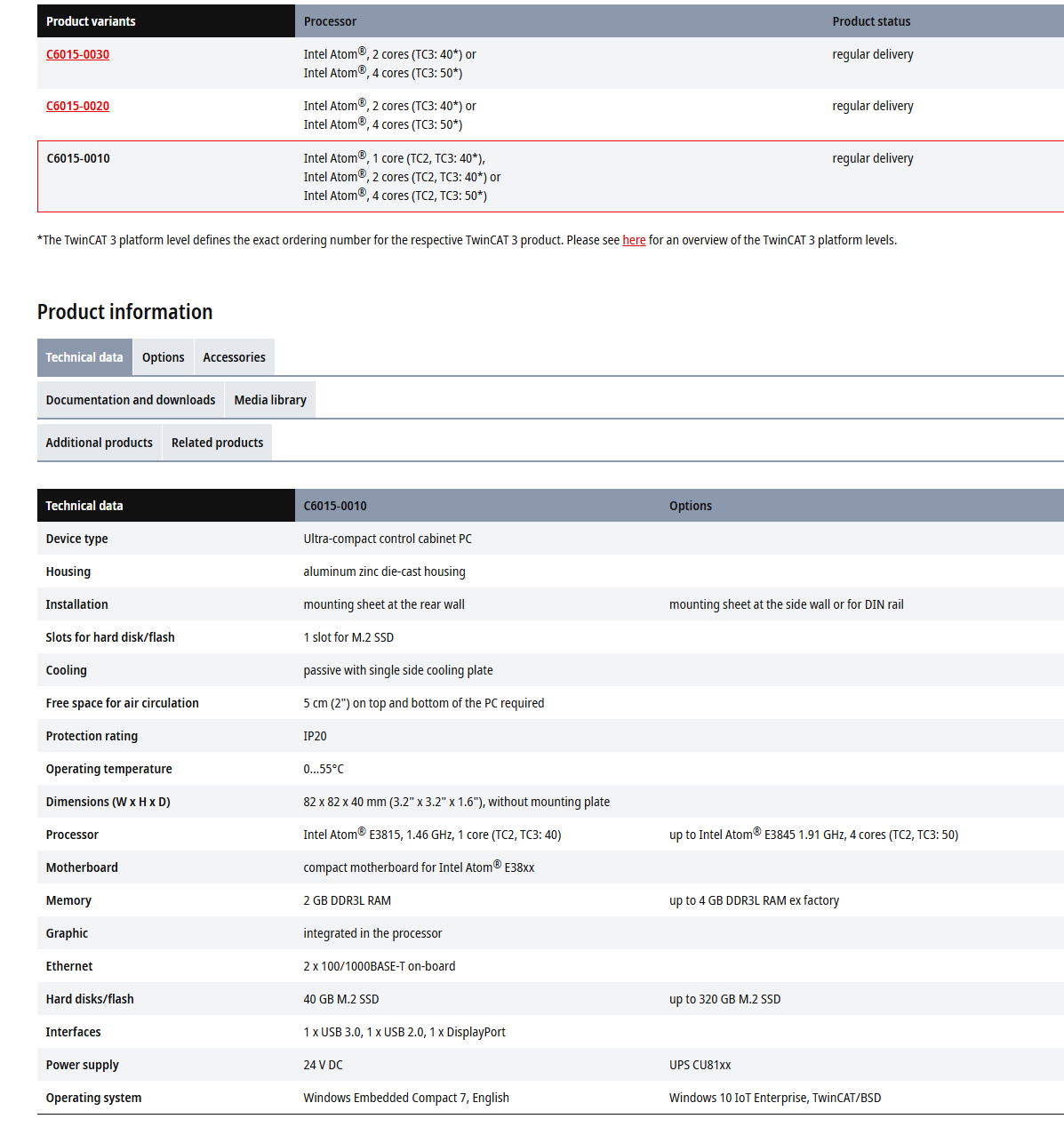 With a mounting space of just 82 x 82 x 40 mm, the C6015 Industrial PC represents Beckhoff’s most compact entry-level Industrial PC and price savings of 25% or more (depending on the configuration) place it well below the previously least expensive x86 PCs. Due to its extremely compact size, the versatile and flexible mounting options and the impressive computing power of the Intel Atom® processors, it fits into virtually any control cabinet and machine concept. Apart from use for a wide range of automation tasks, the C6015 is mainly suitable for use as an IoT gateway, or as an edge device. The basis for this is the full integration and compatibility of TwinCAT and EtherCAT.
