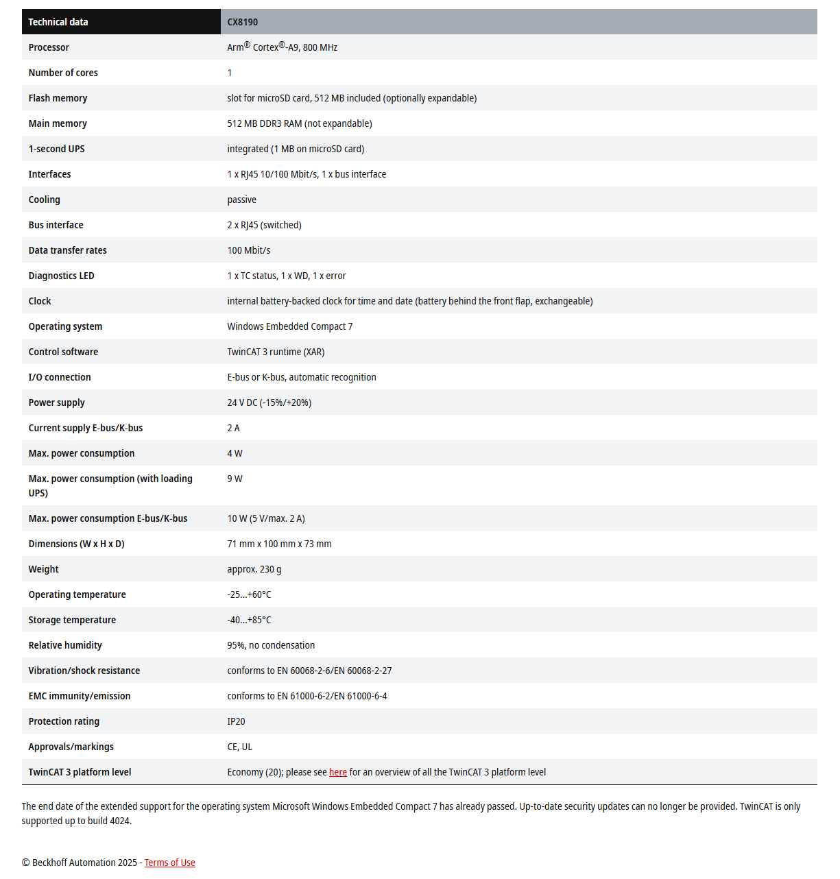 The CX8190 is a controller with two Ethernet ports, one of which is switched to two RJ45 sockets. It supports protocols such as real-time Ethernet, ADS UDP/TCP or EAP (EtherCAT Autom……