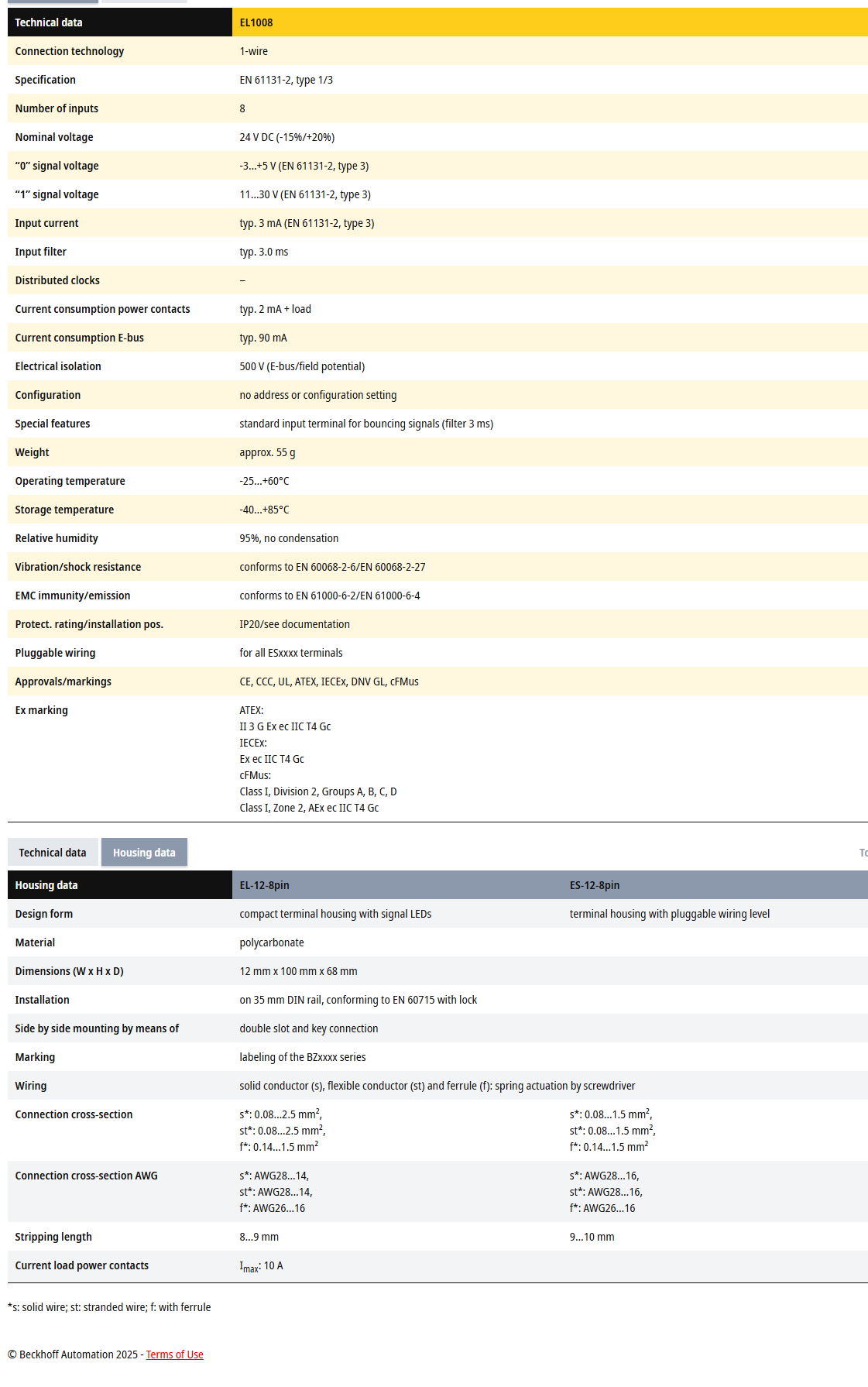 The EL1008 digital input terminal acquires the binary 24 V control signals from the process level and transmits them, in an electrically isolated form, to the higher-level automation unit. Eac……